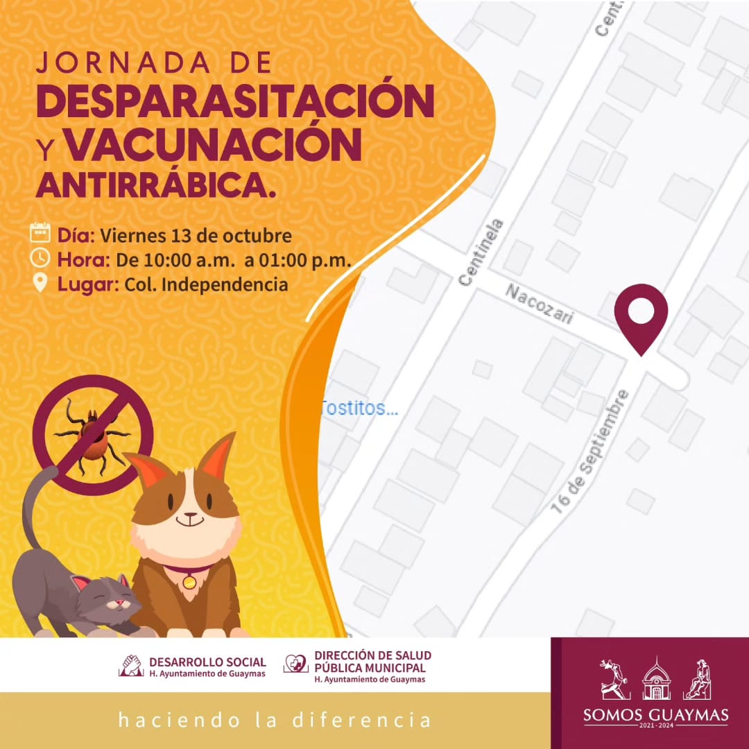 Guaymas, Sonora, octubre de 2023.- En seguimiento con el compromiso de la Doctora Karla Córdova González para prevenir la rickettsia y enfermedades por zoonosis, se llevará acabo ‘Jornada de desparasitación y vacunación antirrábica’ en el sector Independencia y en la cancha de Ocotillo I.