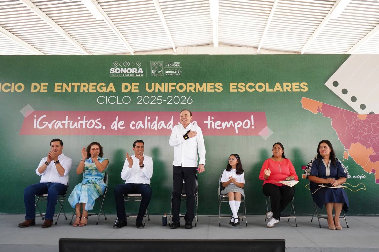 - El mandatario estatal indicó que el proceso de distribución de los paquetes de uniformes escolares gratuitos para estudiantes de nivel básico, inicia de forma oficial este martes 20 de mayo, con la entrega directa en el Centro de Usos Múltiples (CUM) en Hermosillo a los padres de familia.