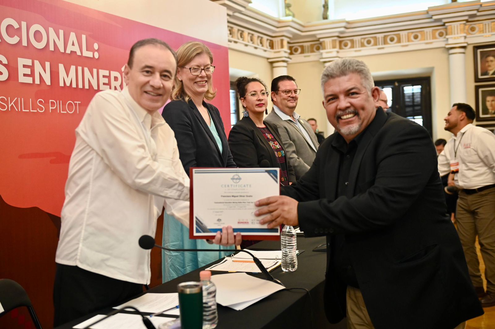 Hermosillo, Sonora; 15 de agosto de 2025.- Con el propósito de fortalecer al sector minero sonorense e innovar con estándares de calidad y seguridad, el gobernador Alfonso Durazo Montaño encabezó la ceremonia de entrega de constancias del programa internacional “Train the Trainer” en minería, impulsado por el Plan Sonora de Energías Sostenibles y desarrollado por la empresa australiana Mining Skills Australia en colaboración con la Embajada de Australia en México para capacitar a personal de minas.
