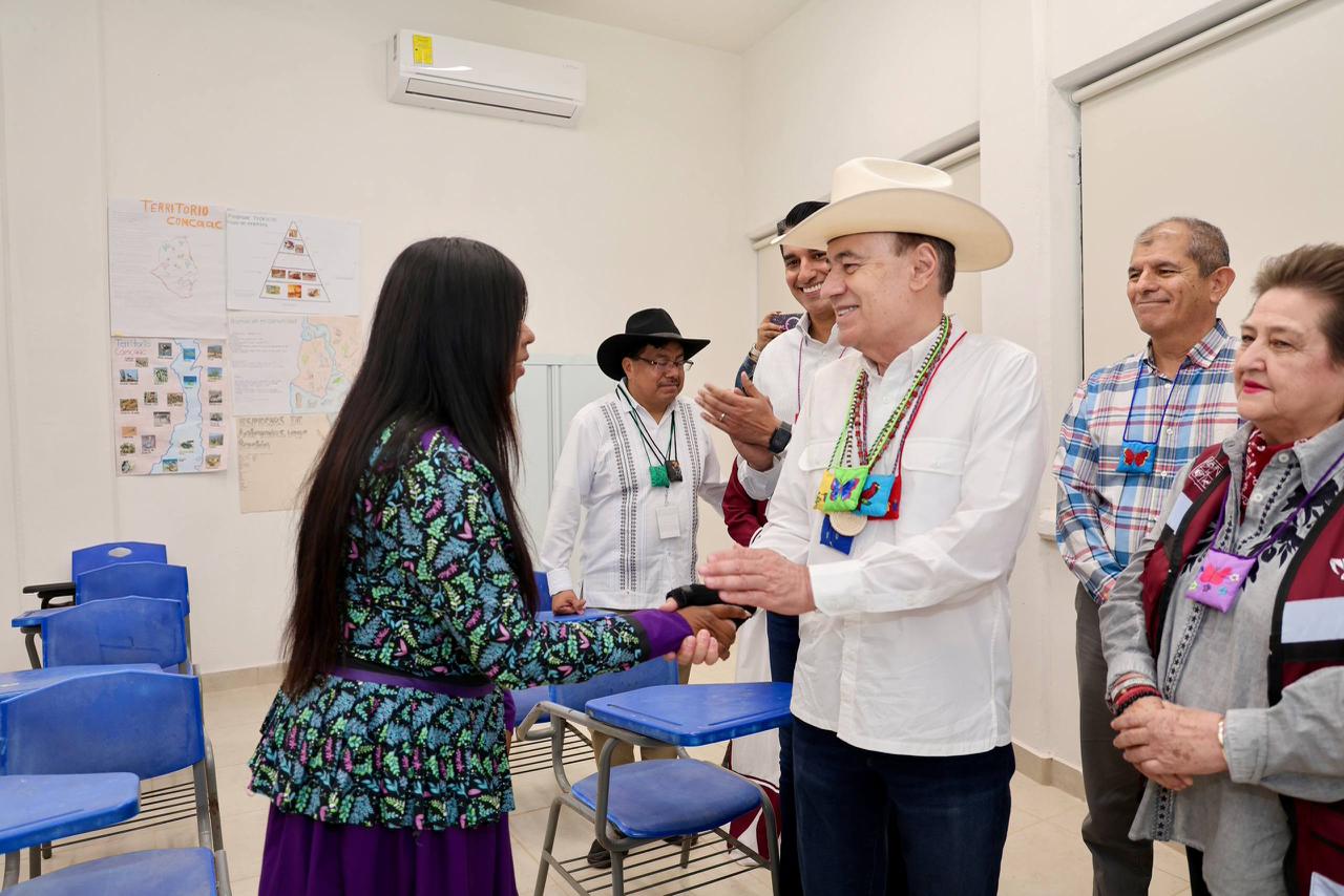 Acompañado del director general del Instituto Nacional de los Pueblos Indígenas (INPI), Adelfo Regino Montes, y de autoridades tradicionales del Pueblo Comca’ac, el mandatario estatal encabezó la develación de la placa conmemorativa, el corte de listón y un recorrido por la infraestructura educativa, que responde directamente a una solicitud histórica de la comunidad.