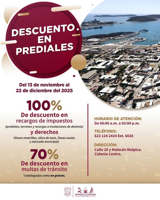 Guaymas, Sonora, 3 de diciembre de 2025.- El Ayuntamiento de Guaymas a través de Tesorería Municipal sigue con descuentos en prediales hasta el próximo 22 de diciembre.