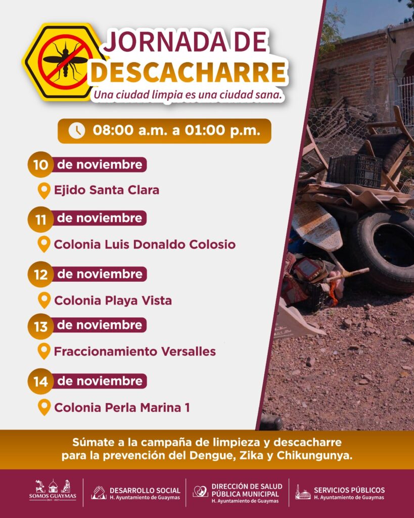 Guaymas, Sonora 7 de noviembre de 2025.- Para dar seguimiento a las acciones preventivas contra el dengue, zika y chikungunya en la comunidad, habrá del 10 al 14 de noviembre Jornada de descacharre de 8:00 de la mañana hasta las 13:00 horas, esto organizado por el Ayuntamiento de Guaymas a través de Desarrollo Social, Servicios Públicos y Salud Pública Municipal.