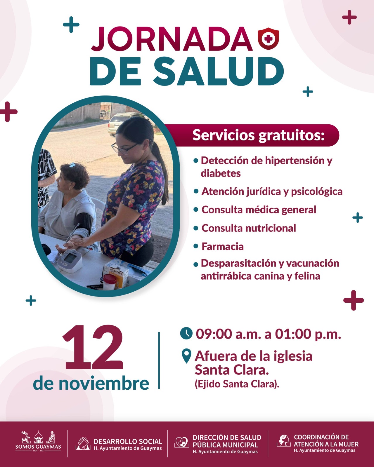 En coordinación con el Ayuntamiento de Guaymas, Desarrollo Social, la Coordinación de Atención a la Mujer y Salud Pública Municipal se instalará este 12 de noviembre módulo de atención en el ejido Santa Clara (afuera de la iglesia Santa Clara) a partir de las 9:00 de la mañana hasta las 13:00 horas.